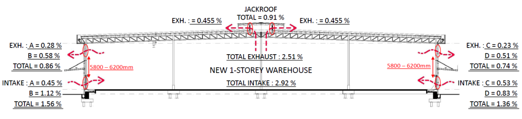 It is a single storey warehouse using natural ventilation design with adequate openings for make-up and natural smoke vent. Quantitative design review was presented to BOMBA with details calculation on the geometry louver openings.