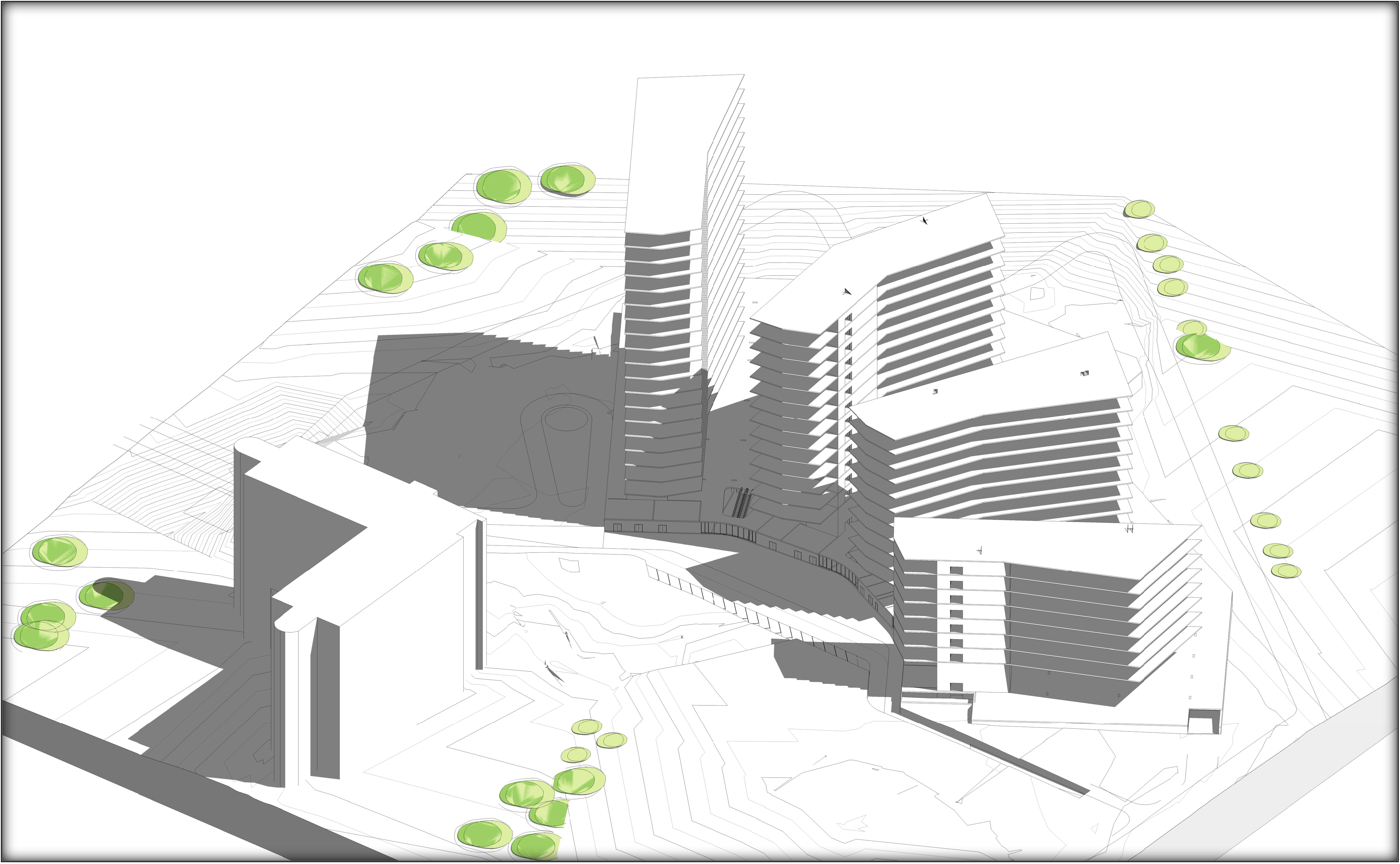 This is an offices development, which consists of 4 nos. of office towers of varying heights, auditorium, conference hall and etcetera. The high volume podium is connecting the 4 towers which requires performance based approach for waiver of fire compartments.